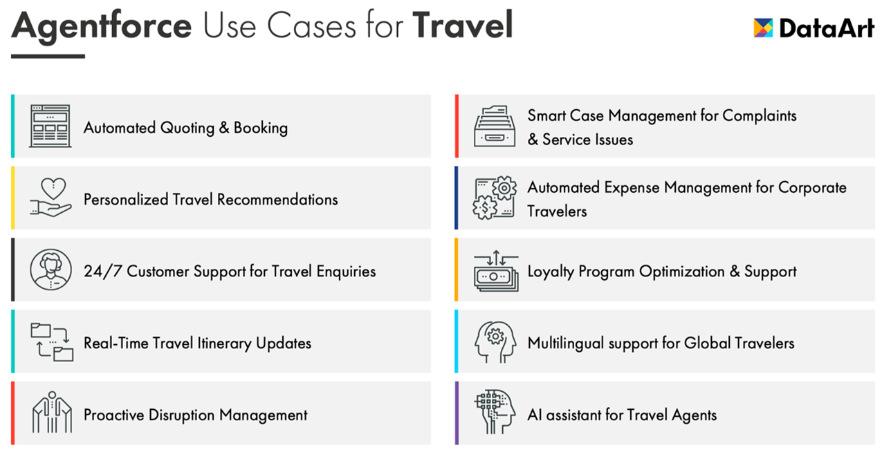 The scope of automation possibilities extends across every customer touchpoint. Modern AI agents, such as Agentforce, can handle everything from initial quote generation and booking completion to proactive flight disruption management and multilingual customer support. They can process expense reports for corporate travelers, optimize loyalty program redemptions, and even serve as intelligent assistants to human agents during complex negotiations.